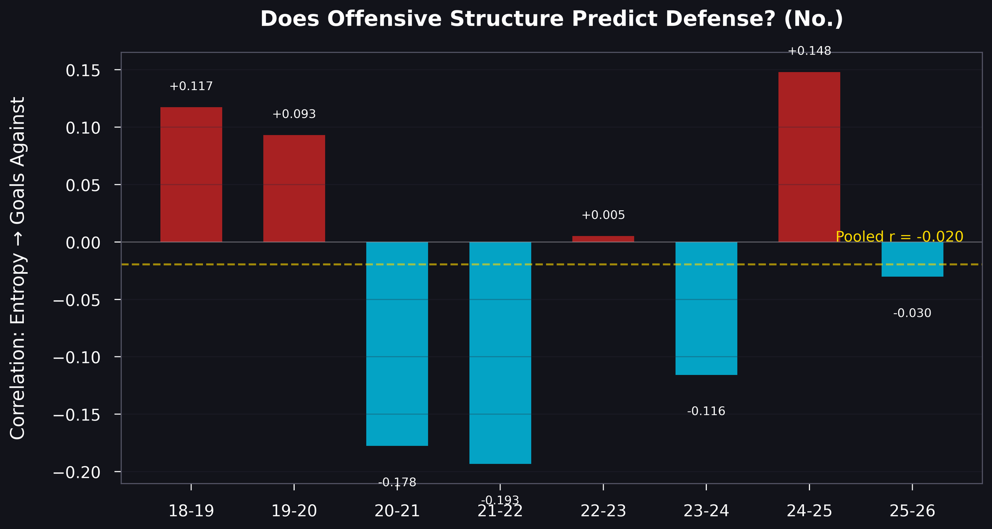 Location entropy shows no meaningful association with goals against in this analysis. The pooled within-season correlation is r = −0.020, p = 0.76. Across eight seasons, only 44% of individual season correlations point in the expected direction — essentially a coin flip.