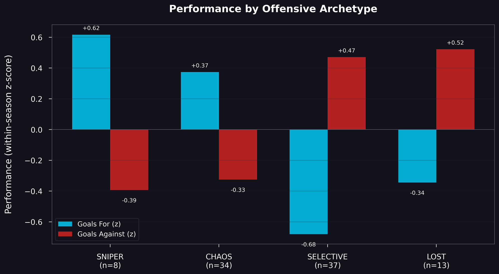 Look at the SELECTIVE bar. Teams doing exactly what shot quality theory says they should, concentrating shots from dangerous areas, are the worst offensive archetype in the NHL. Worse than the LOST teams who do everything wrong. Their net goal differential is a full standard deviation below league average.