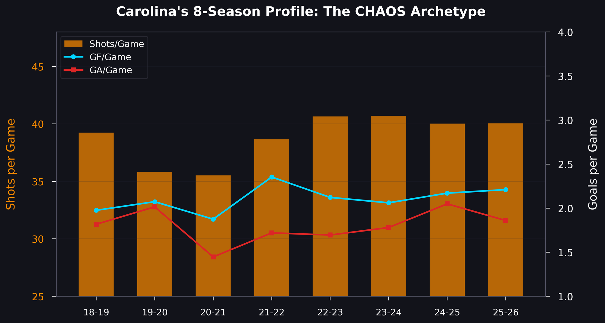 The Hurricanes have been classified CHAOS in seven of eight seasons. Their formula: shoot from everywhere, shoot constantly, overwhelm opponents with volume regardless of location. They regularly push toward 40 shots per game, season after season, from high-entropy locations that would make a shot-quality purist wince. It works well enough to sustain strong regular-season performance and repeated playoff qualification.