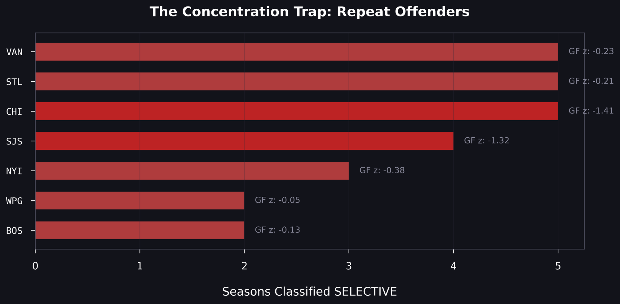 The reason is straightforward once you see it: concentration without volume is a losing formula. These teams avoid bad shots, which is smart. But they also don't generate enough total shots, which is fatal. These teams pair shot concentration with low shot generation, a combination that is consistent with less sustained offensive-zone time and weaker overall puck control.