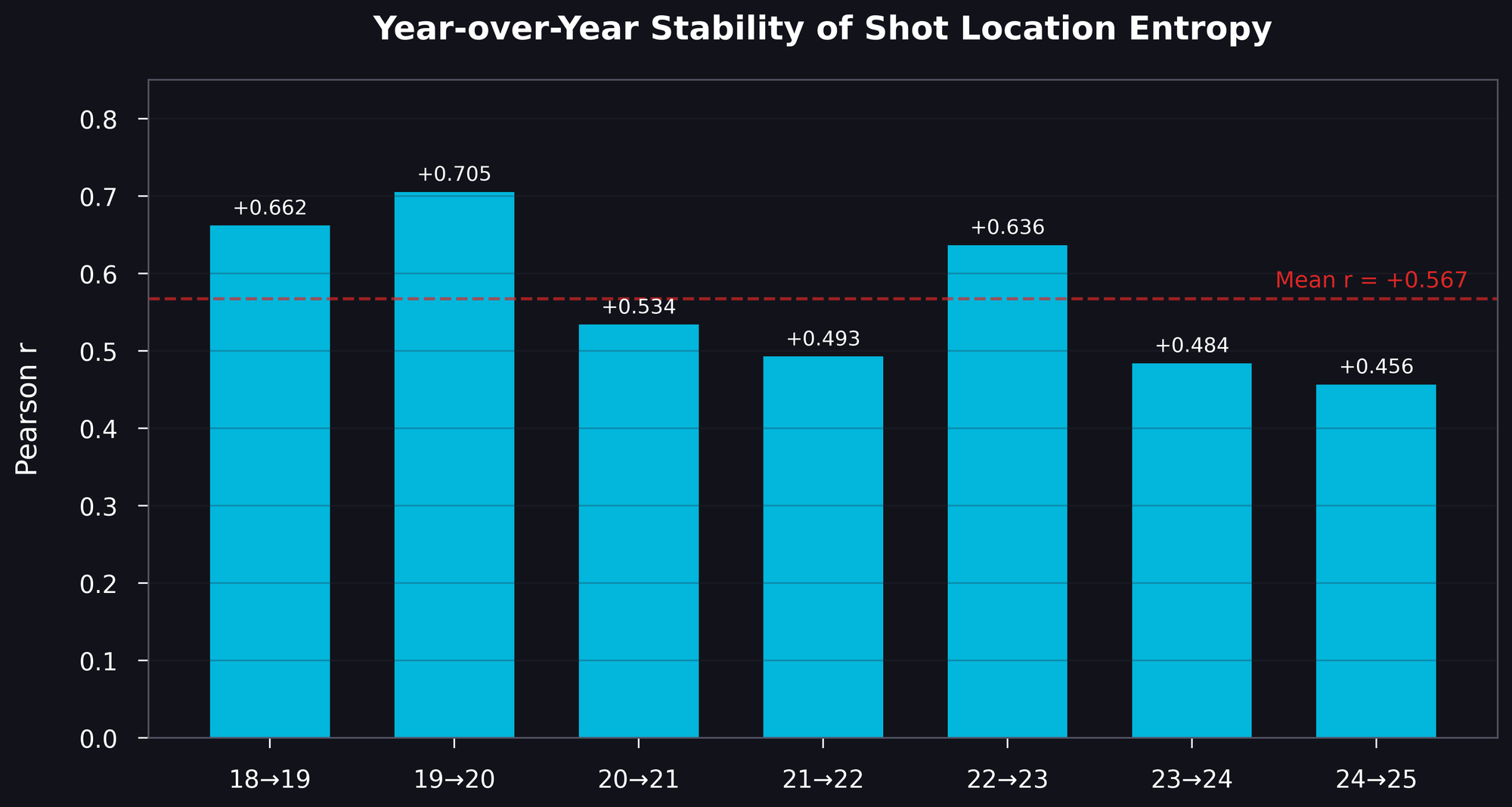 An average year-to-year correlation of r = +0.57 across seven seasonal transitions is strong for a team-level hockey metric. It is consistent with persistent organizational factors, such as coaching philosophy, personnel deployment, and strategic intent. Entropy does consistently.