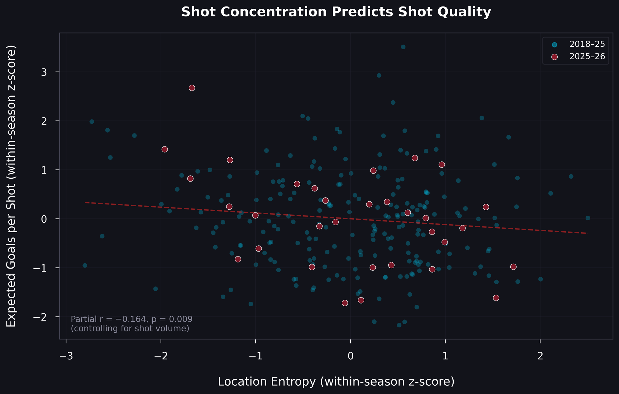 After controlling for shot volume (because teams that shoot more tend to have higher observed entropy, due to both sampling and offensive-process effects) and standardizing within each season (to account for league-wide trends), the partial correlation is r = −0.164, p = 0.009. The direction is consistent in seven of eight individual seasons.