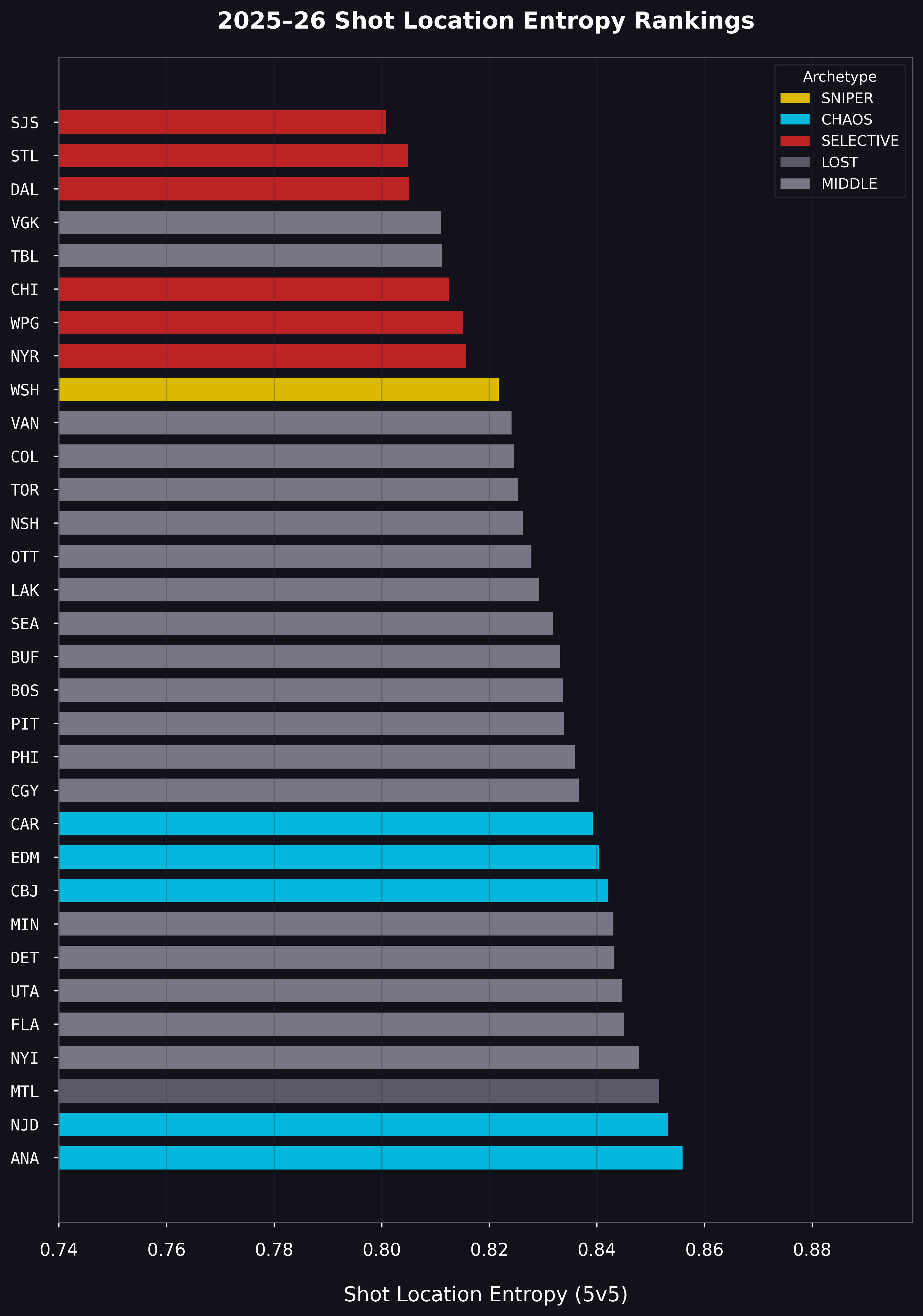 But entropy, crossed with shot volume, reveals something the rankings alone don't. The most disciplined offenses in the NHL are also its worst. That's Part 2: The Concentration Trap.
